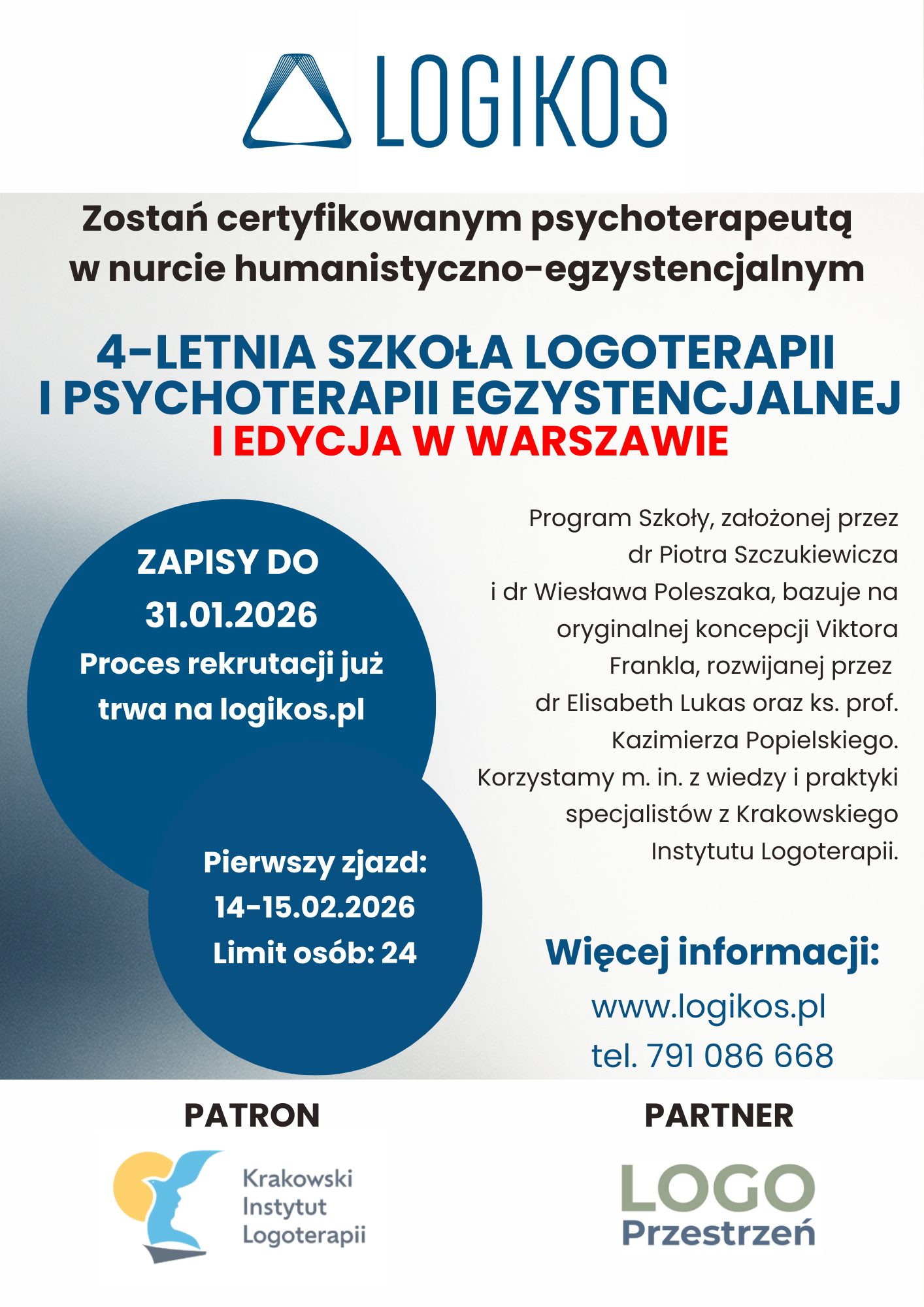 Od lutego – start 4-letniej Szkoły Logoterapii – całościowego szkolenia psychoterapeutycznego organizowanego i prowadzonego przez Logikos.